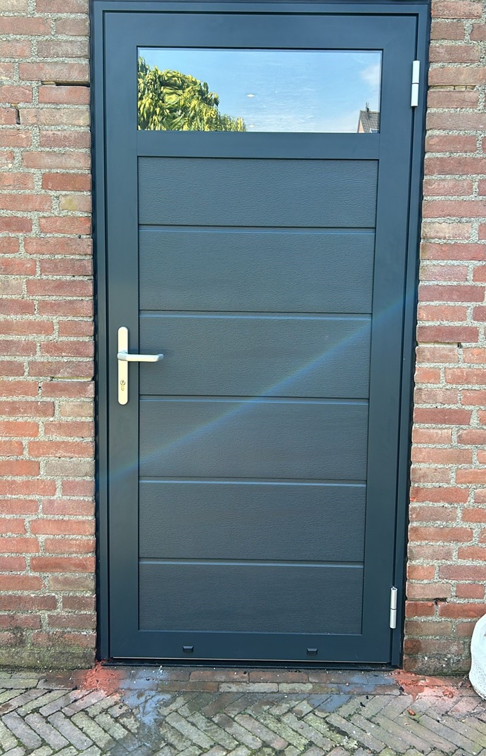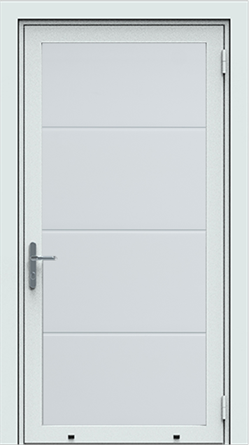 Deze enkele openslaande deur is opgebouwd uit 40 mm dikke geïsoleerde panelen en functioneert als een loopdeur in openslaand model. De maximale breedte is 1500 mm. De deur kan in dezelfde uitvoeringen, structuren en kleuren geleverd worden als de dubbele openslaande deuren. Standaardkleur is RAL 9016.