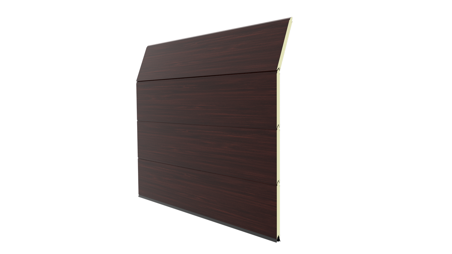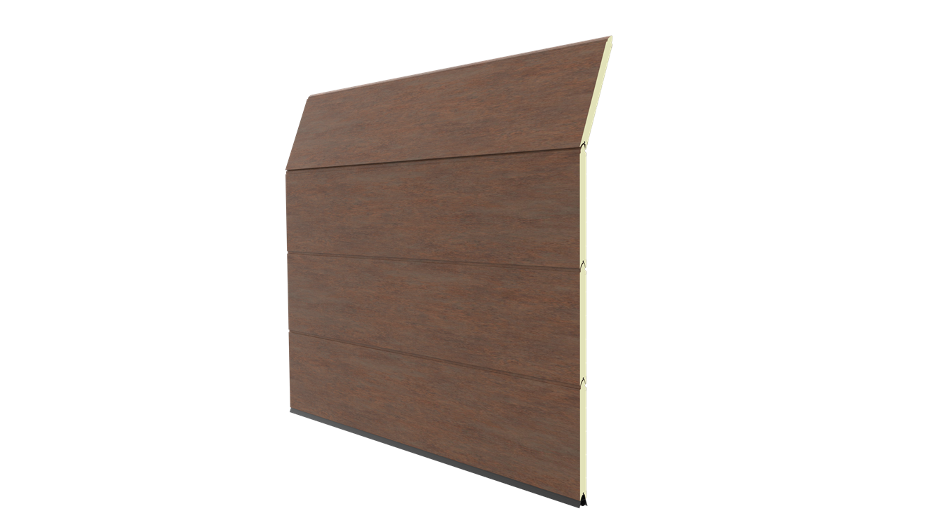 Deze 40 mm dikke geïsoleerde garagedeur is uitgevoerd zonder horizontale belijning, maar voorzien van een woodgrainstructuur. Standaardkleuren zijn RAL 9016 en RAL 7016.