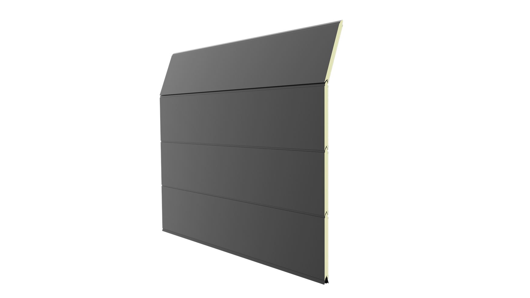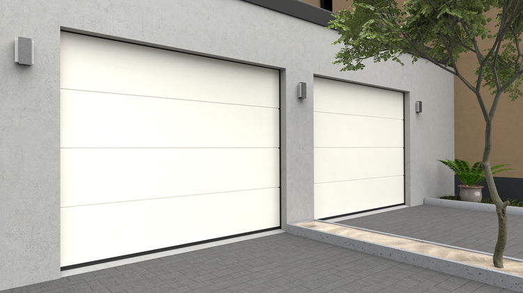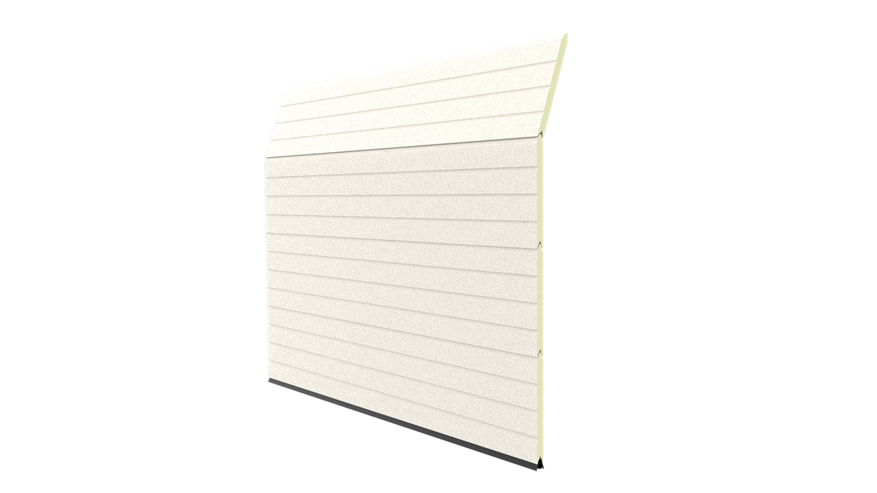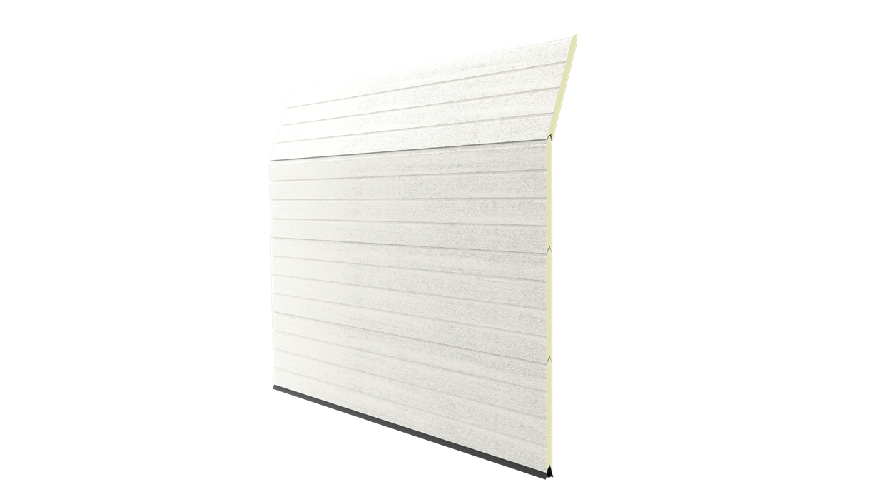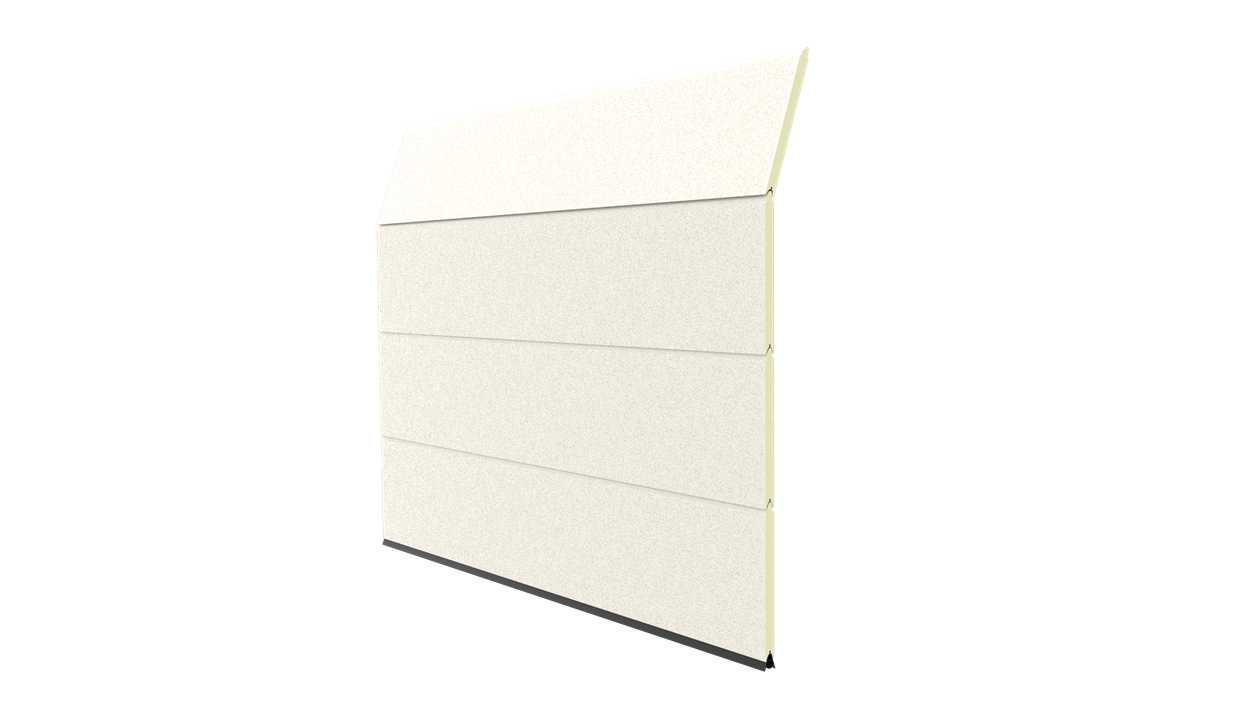 Deze 40 mm dikke geïsoleerde garagedeur is uitgevoerd zonder horizontale belijning en het oppervlak is glad. Standaardkleuren zijn RAL 9016, 7016, 9005, 9006 en 9007.
