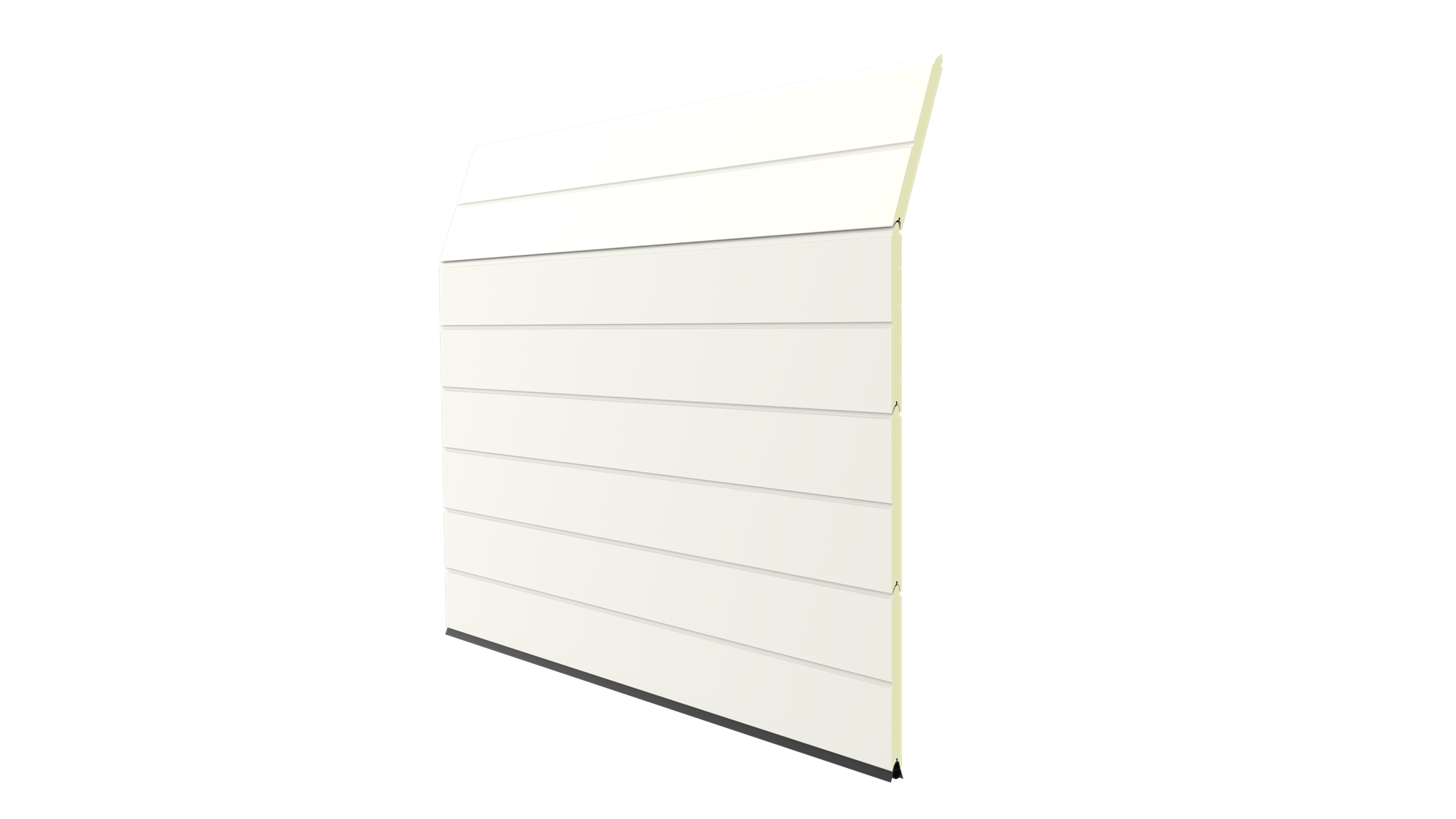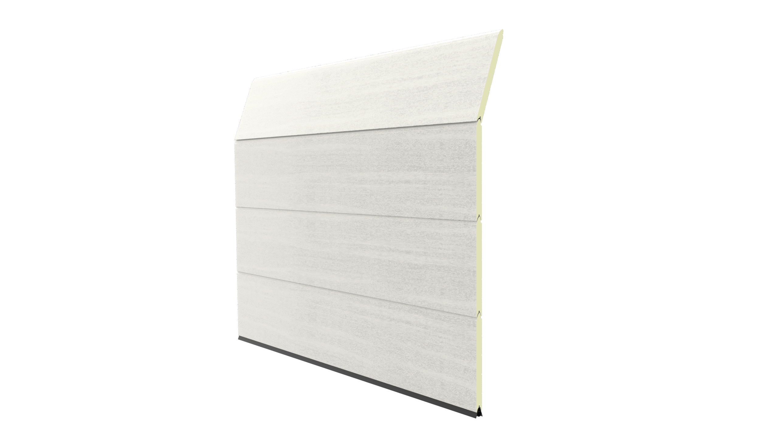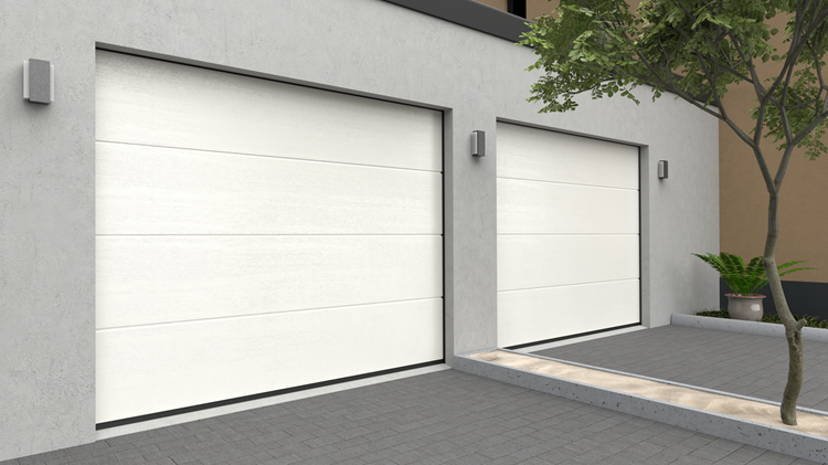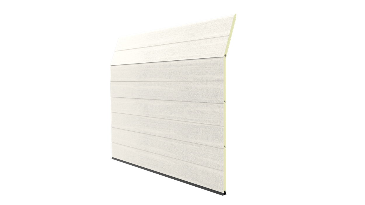 Deze 40 mm dikke geïsoleerde garagedeur heeft per paneel één diepe horizontale belijning en een woodgrainstructuur. Standaardkleuren zijn RAL 9016 en RAL 7016.
