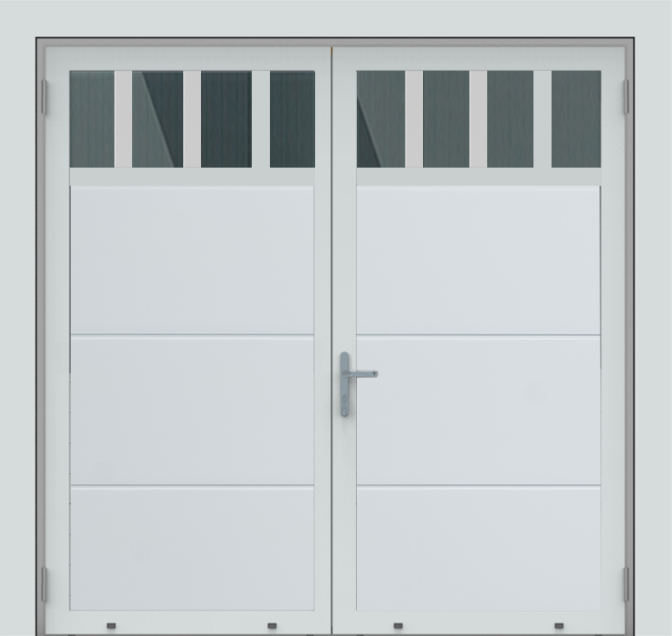 Deze openslaande deuren zijn opgebouwd uit 40 mm dikke geïsoleerde panelen en uitgevoerd met een horizontaal glaspaneel met meerdere vensters. Standaardkleur is RAL 9016.