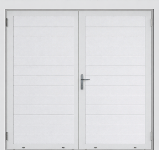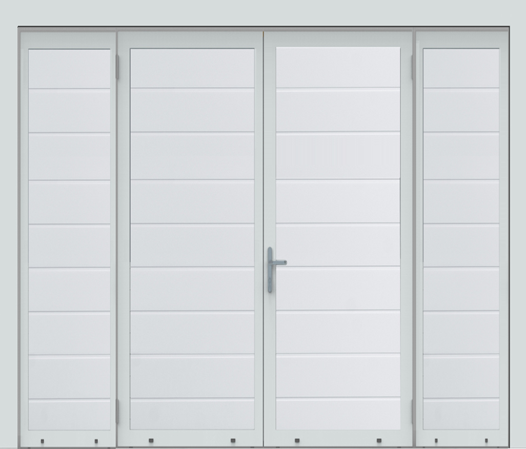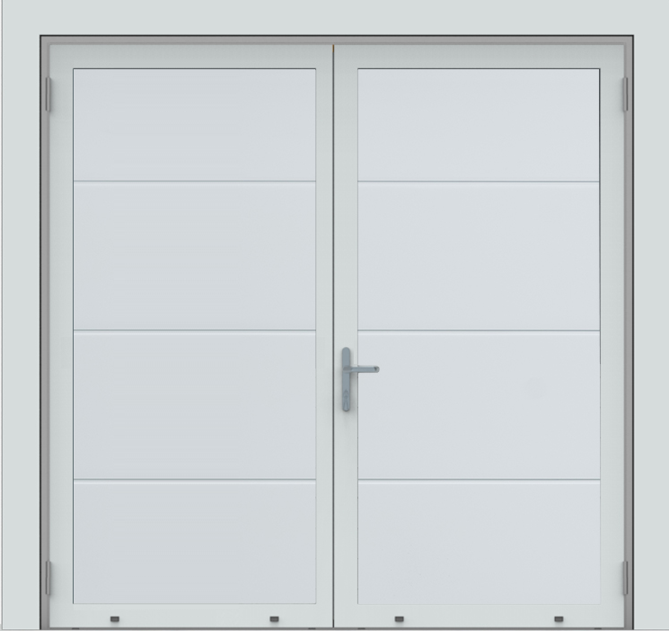 Deze openslaande deuren zijn opgebouwd uit 40 mm dikke geïsoleerde panelen met meerdere diepe horizontale belijningen en het oppervlak is glad uitgevoerd. Standaardkleur is RAL 9016.