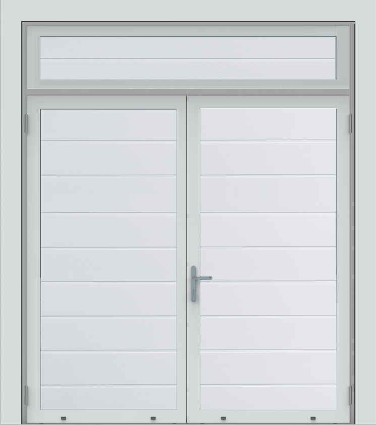 Deze openslaande deuren zijn opgebouwd uit 40 mm dikke geïsoleerde panelen en uitgevoerd met een vast bovenpaneel dat met glas is gevuld. Standaardkleur is RAL 9016.