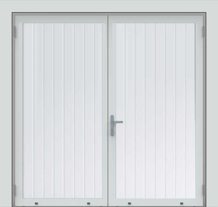 Deze openslaande deuren zijn opgebouwd uit 40 mm dikke geïsoleerde panelen en uitgevoerd met een verticaal glaspaneel in één of beide deurvleugels. Standaardkleur is RAL 9016.